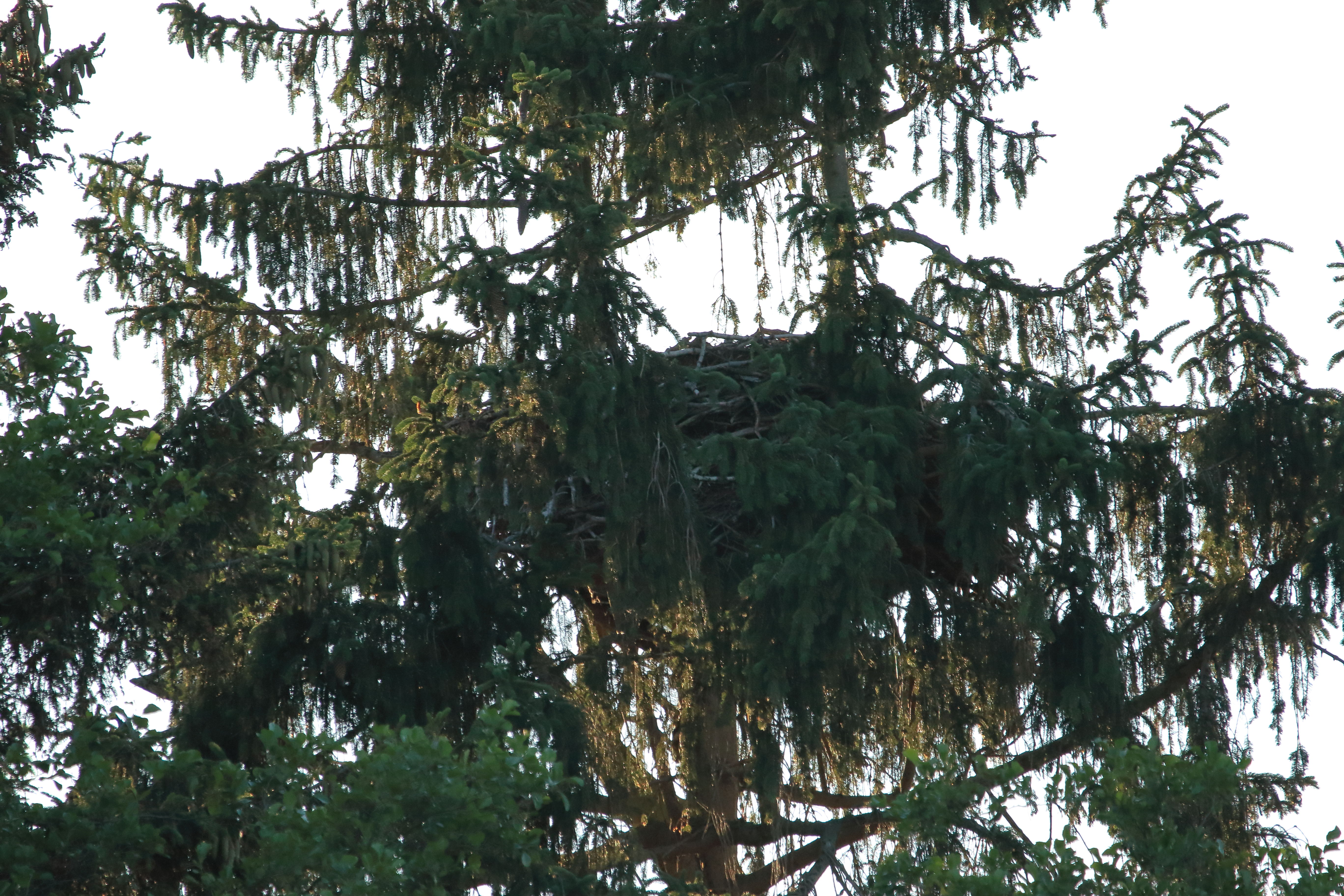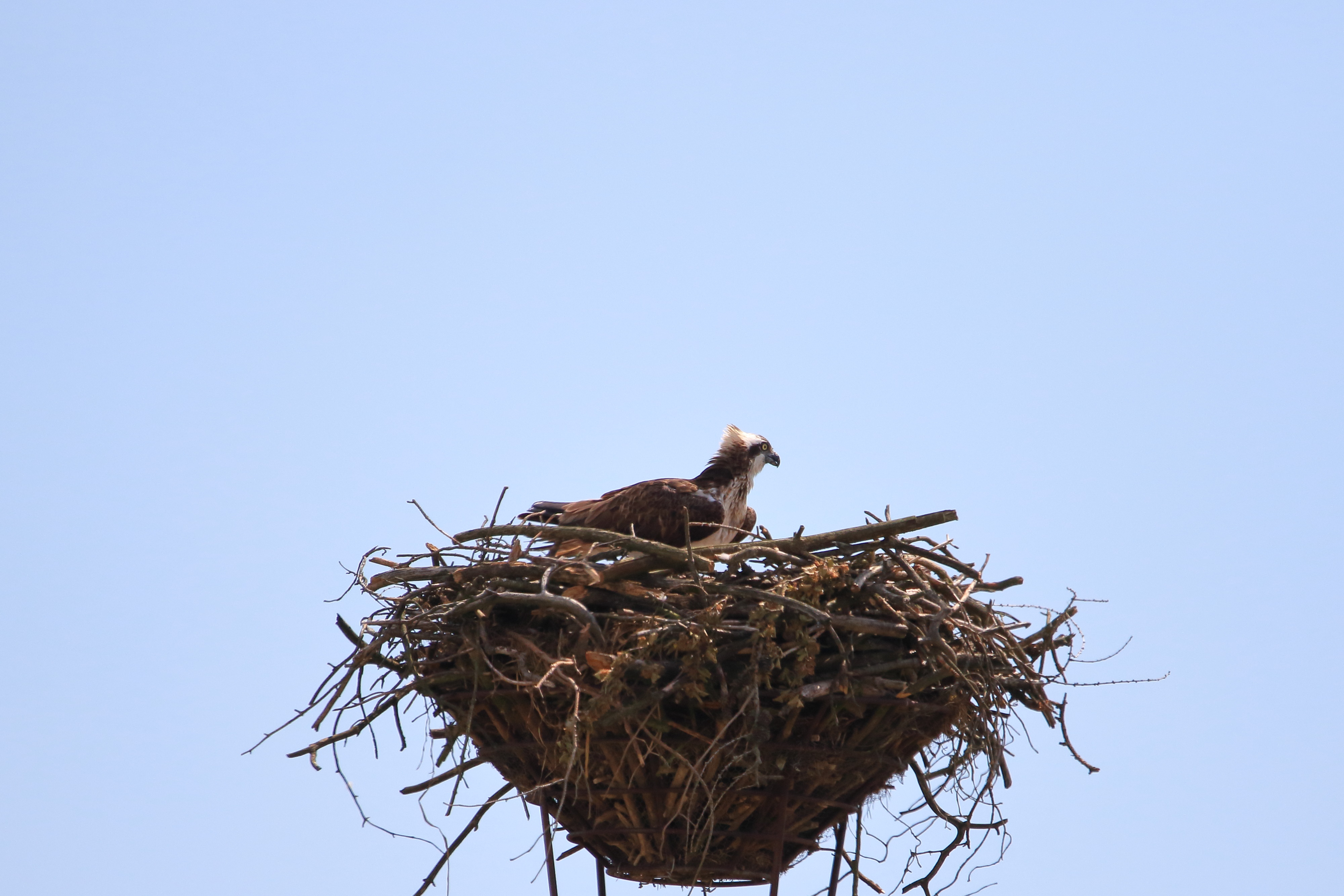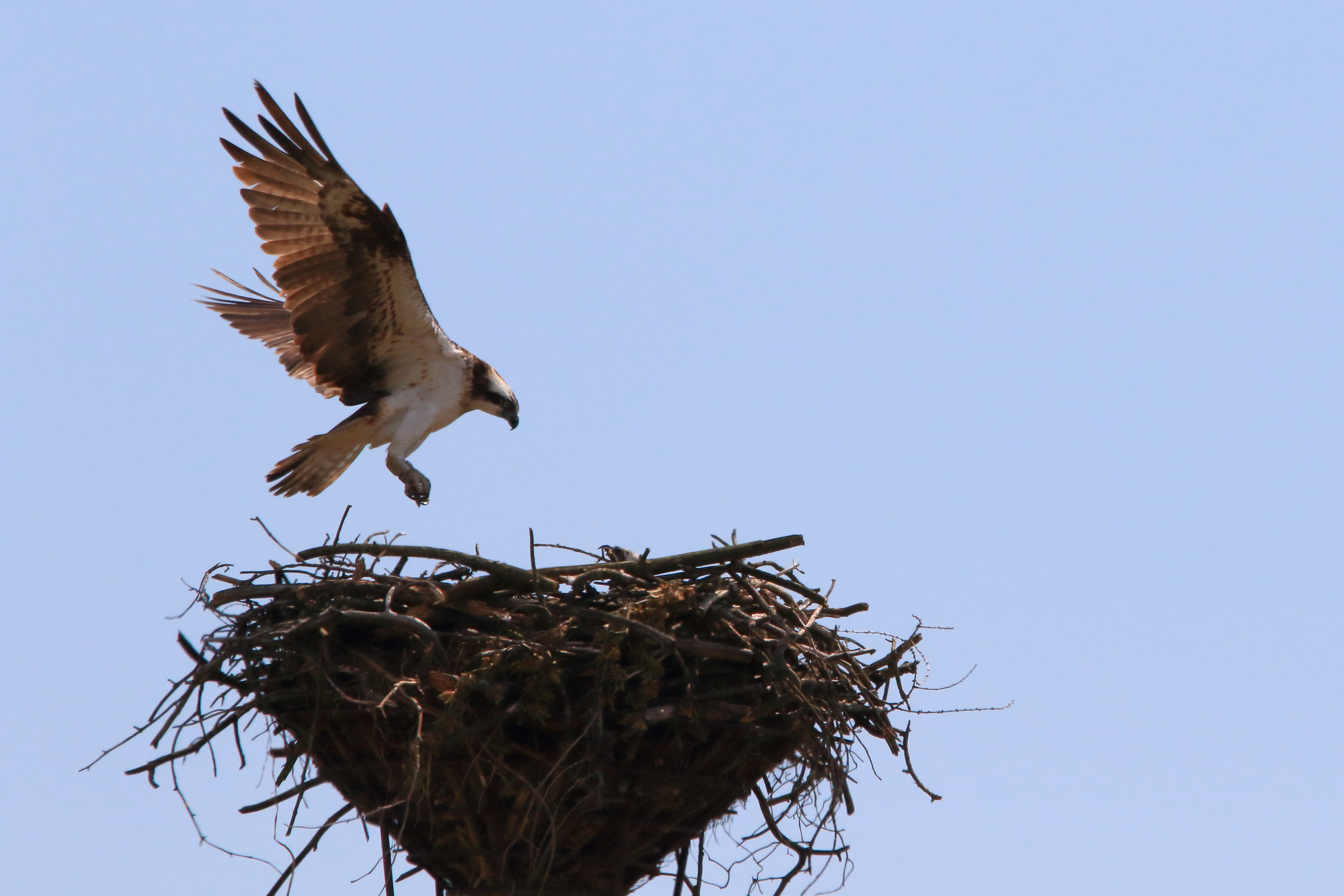 Ein seltenerer und deutlich kleinerer Verwandter ist der Fischadler. Hier landet er auf seinem Horst, wo schon der Jungvogel auf Nahrung wartet